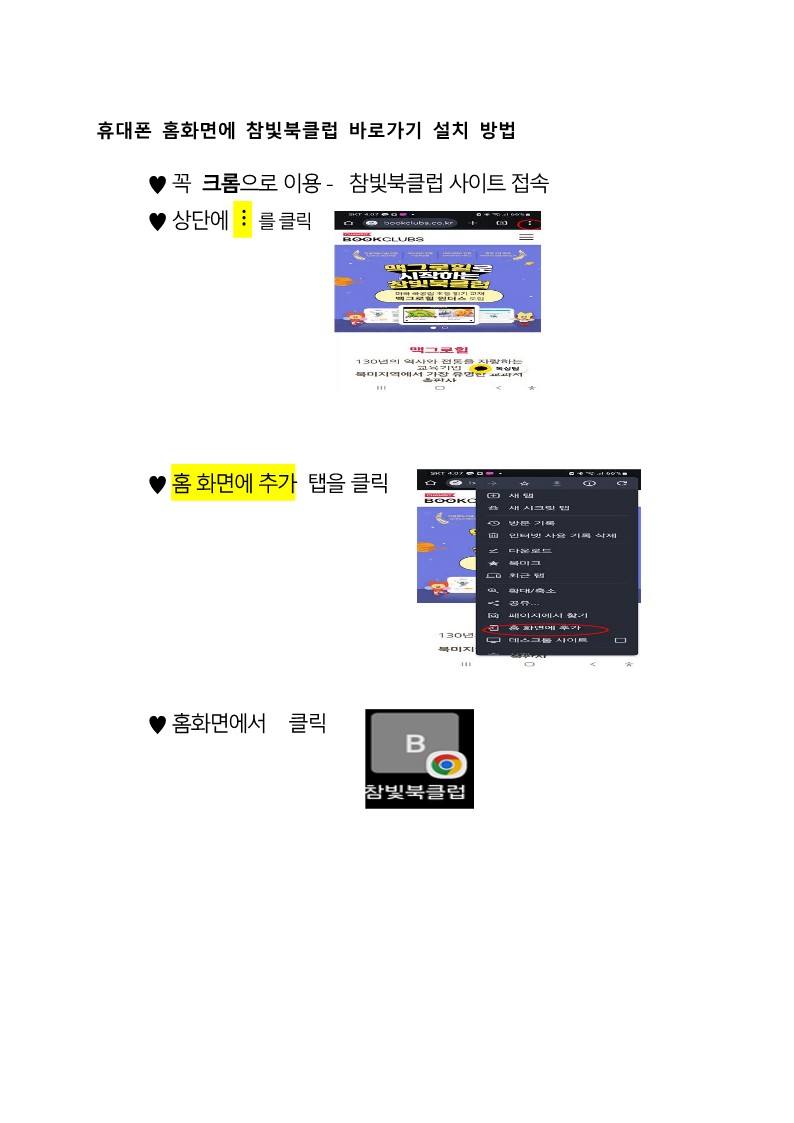 휴대폰 홈화면에 참빛북클럽 바로가기 설치 방법